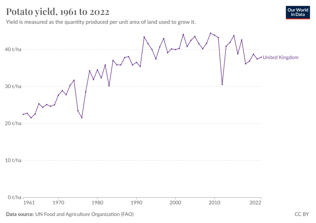 In the 60 years of data about the production of potatoes in the U.K. there have been two unquestionable impacts of weather. The first occurred in the drought and heat years of 1975 and ’76. The second occurred in the washout year of 2012, though not, curiously, in the non-summer of 2008 and the ‘barbecue summer’ of 2009, which left the U.K. Met Office with egg on its face. However, the consequences of these disappointing years for society more broadly is very far from famine. Whereas potato famers produced 100kg of their crop per person in the U.K. in 2011, in 2012 this fell to 72Kg, the difference being made up by imports, mostly the following year. Chips and crisps may have cost slightly more, but nobody went hungry. And imports are perhaps the explanation for the gradual decline of overall production of the crop, too. Despite the ‘crisis’, potatoes are retailing for as little as 75p/kg in supermarkets.