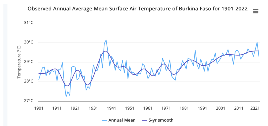 Both Burkina Faso and Mali show similar average temperature trends and in common with many countries near the equator recent warming has been much less than territories further north. In fact, a large spike during the 1930s, presumably unrelated to humans burning hydrocarbons, was followed by an 85-year pause with little or no warming. The five year 2022 smoothed average temperature of 29.57oC in Burkina Faso, shown above in a World Bank climate graph, is almost exactly the same as that recorded in 1938. In Mali, the temperature difference between these two years is just 0.2oC.