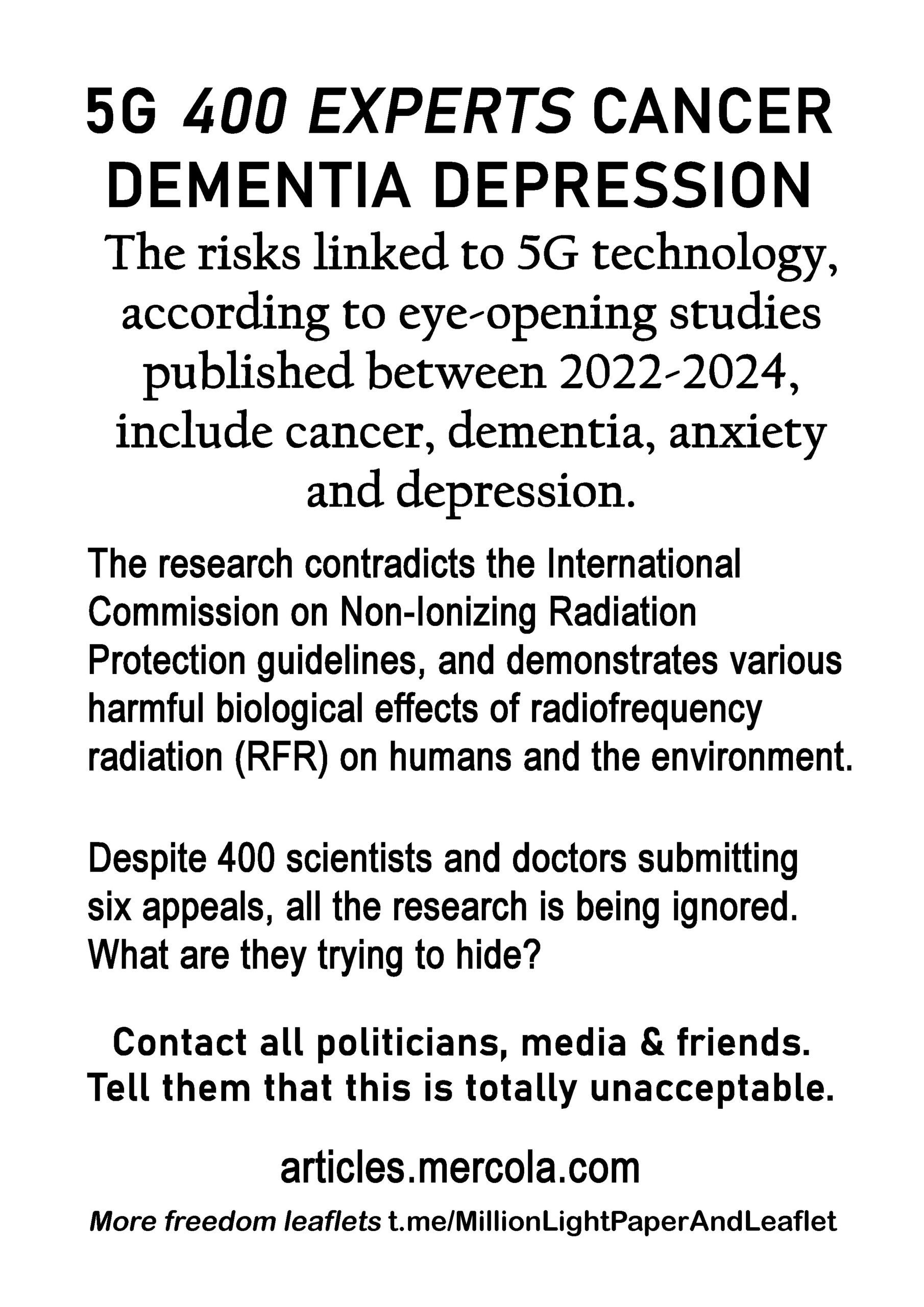 5G 400 Experts Cancer Dementia Depression – latest leaflet to print at home and deliver to neighbours or forward to politicians, including your local Reform Party candidate, your local vicar, media and friends online.