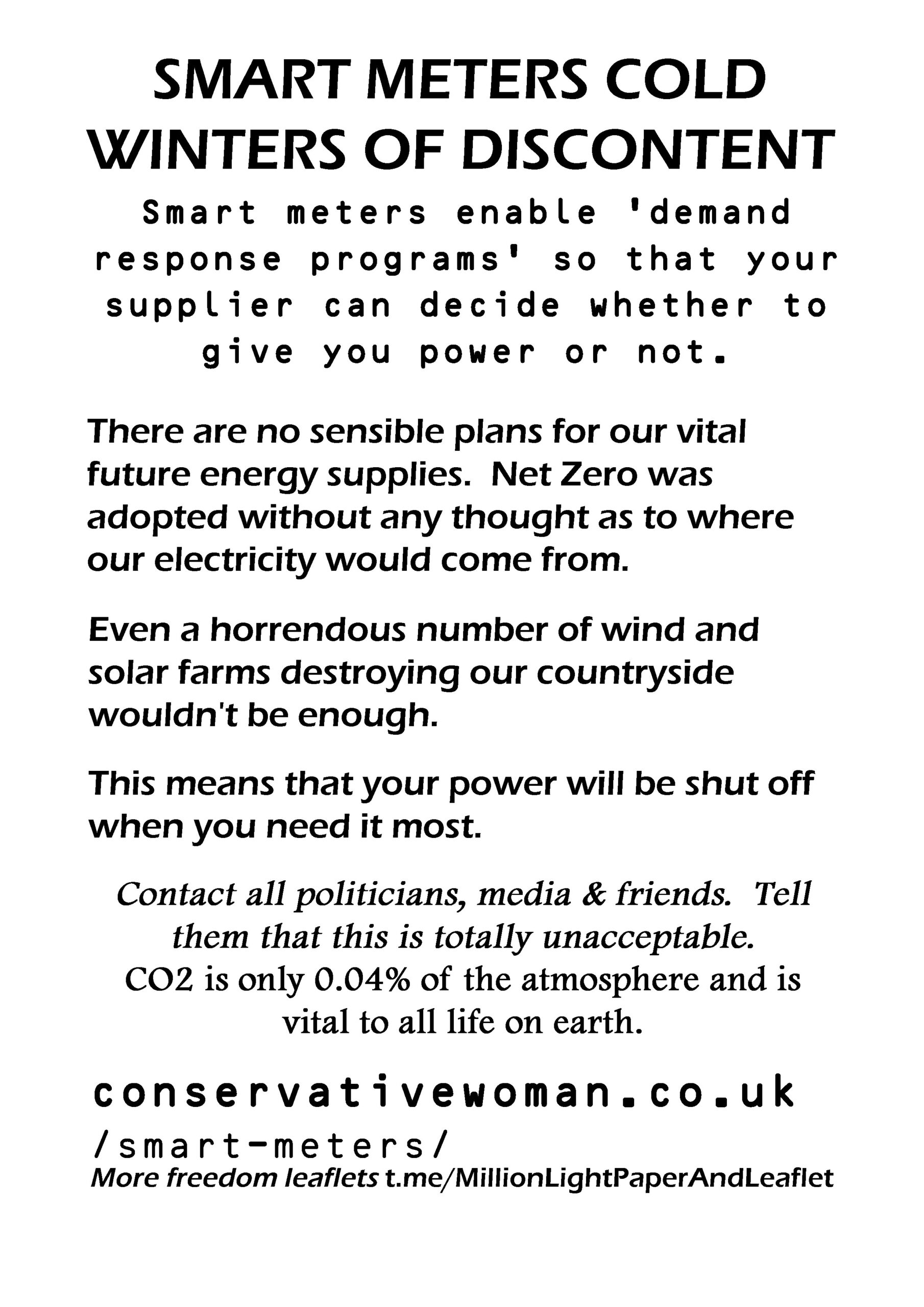 Smart Meters Cold Winters Of Discontent – latest leaflet to print at home and deliver to neighbours or forward to politicians, including your local Reform Party candidate, your local vicar, media and friends online.