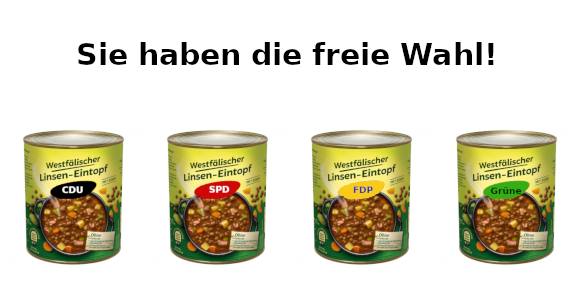 “Proportional Representation”-themed image I created yesterday. The name of the product is “Westfalian Lentil Stew”, a very cheap and popular kind of ready-made food in Germany. The manufacturer’s labels show the names of main German establishment parties (CDU, Christian-Democratic-Union, SPD, Social-Democratic Party of Germany, FDP, Democratic Freedom Party of Germany and Grüne, Greens) and their respective party colours. The text above means “Your Freedom of Choice!”.