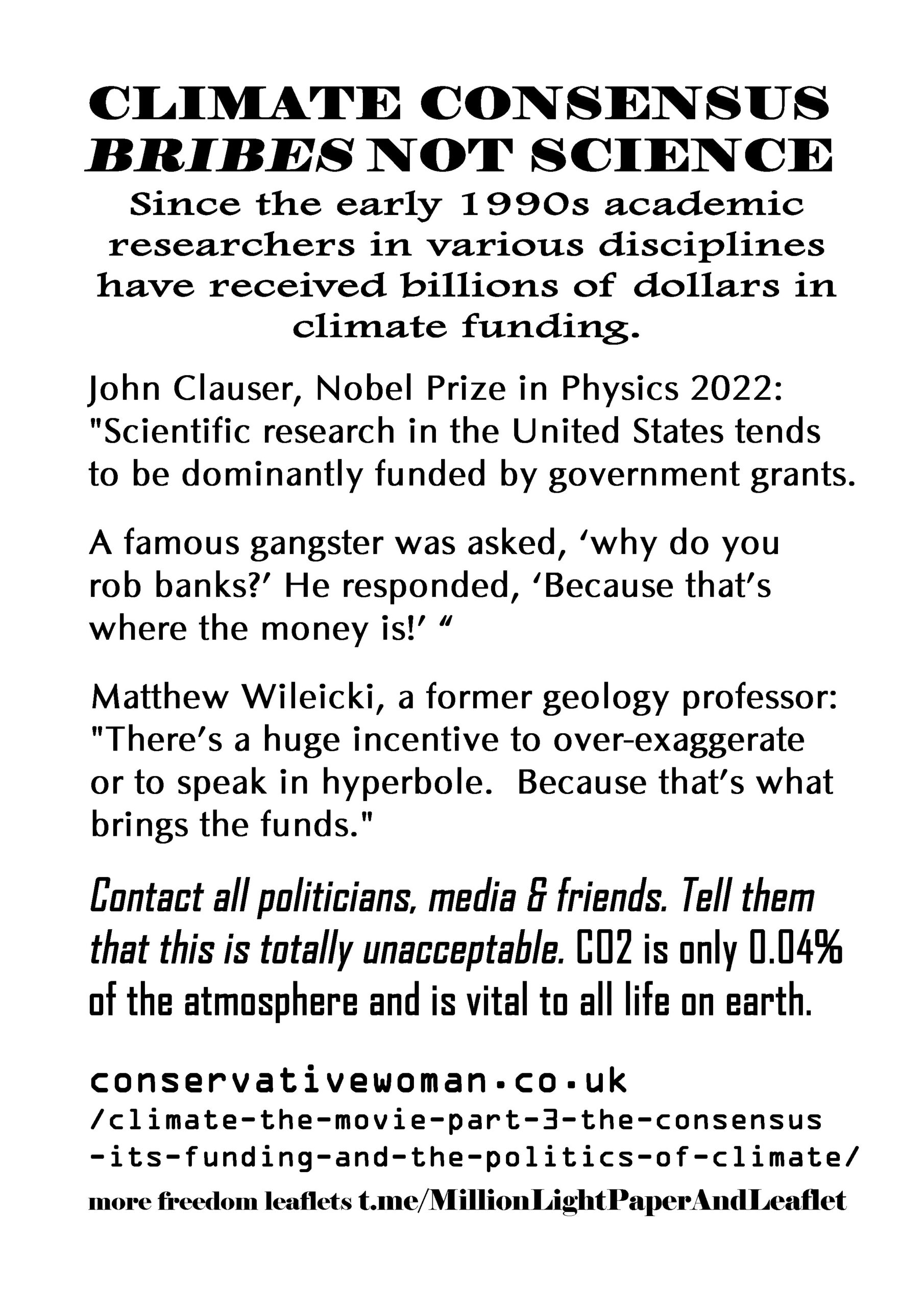 Climate Consensus Bribes Not Science – latest leaflet to print at home and deliver to neighbours or forward to politicians, including your local Reform Party candidate, your local vicar, media and friends online.