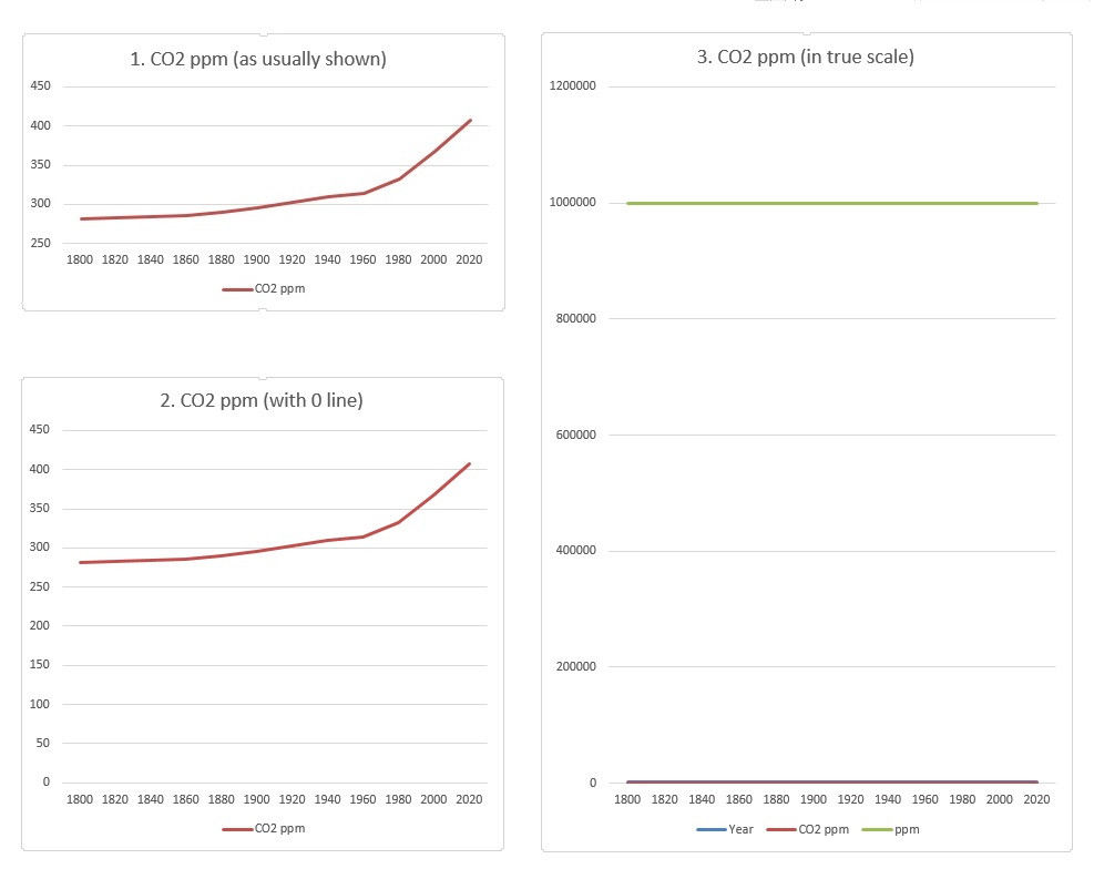 For such big names such as NOAA or Reuters I expect an attention to detail rooted in the Western scientific traditions. Underpinning all the climate hysteria is usually a graph showing the inexorable rise in atmospheric CO2. While CO2 is still a trace gas and measured in parts per million it is usually shown just in relation to itself (see graph 1. below). In graph 2 below a zero baseline has been added to give a better relationship. In graph 3 CO2 is shown in the context of a 1,000,000 particles. Graph 3 is actually what we are being made to hyperventilate about. The fact that none of the prestigious organisations that have been built on Western scientific traditions ever show CO2 in it’s true context betrays the standard of thinking within these organisations as worse than unscrupulous 2nd hand car salesmen. Apologies to 2nd had car salesmen because you can at least get a car that will work.