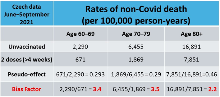 As you can see from the computation, the ‘bias factor’ (last row) is simply the inverse of the pseudo-effect of vaccination. It tells us how much more likely the unvaccinated are to die ‘in general’, as compared with those who completed the two-dose protocol at least four weeks earlier. Formally, it should be called the bias correction factor, but we’ll keep it short.