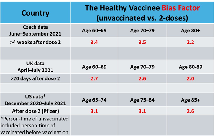 Notably, the bias factor in data from different countries and cultures varies in a narrow range: between 2 and 3.5. It is lower in the oldest age group but is still at least 2. Overall, the unvaccinated are two to three times more likely to die from various causes than the fully vaccinated.