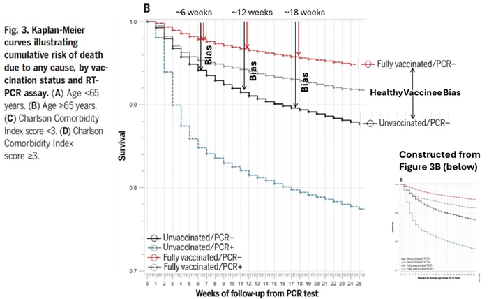 The authors computed rates of all-cause death in periods of Covid waves and in periods of low (almost no) Covid deaths. The latter are essentially rates of non-Covid death, which means that any ‘effect’ of the Covid vaccines during these periods is a pseudo-effect: it is the healthy vaccinee phenomenon alone. In each period, they compared the mortality rate between the unvaccinated and various groups of vaccinated people.