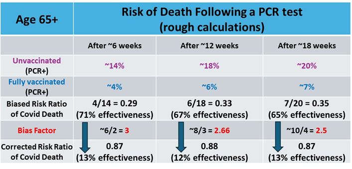 To remove the healthy vaccinee bias, we multiply the biased rate ratio of Covid death by the bias factor, as explained elsewhere. For example, if the biased rate ratio of Covid death is 0.4 (60% ‘vaccine effectiveness’) and the bias factor is 2.5, the correct effect on Covid death is 0.4 × 2.5 = 1, which is 0% vaccine effectiveness.