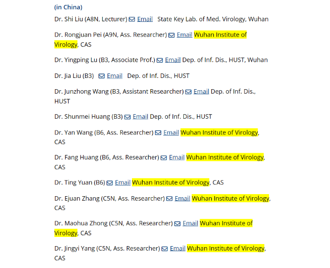 Fully one-third of the principal investigators based in China, four out of twelve, were at the Wuhan Institute of Virology. They include none other than Xinwen Chen, who was at the time the director of the WIV, as well as Rongge Yang and Binlian Sun, the researchers whose work on the HIV envelope protein gp120 maps onto the HIV inserts. The HUST had five senior members of the research team, so one more than the Wuhan Institute.