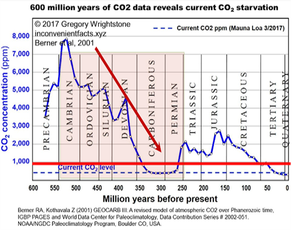 Could it be that the end-Permian extinction was actually caused by CO2 starvation? During the Permian, it was the first time in Earth’s history that CO2 concentrations fell below 1,000 parts per million, perhaps as dangerously low as 200 ppm at some points. This may well have started to stress plant life since 1,000 ppm is a concentration that supports maximum photosynthesis productivity. This is the view of Jim Steele, Director Emeritus of San Francisco State University’s Sierra Nevada Field Campus. In a recent paper, he noted that many researchers have pointed to competition between different plant species for declining CO2 during the Permian period. This was said to result in “severely reduced photosynthesis, the collapse of primary productivity and a significant malfunction of the global food webs”.
