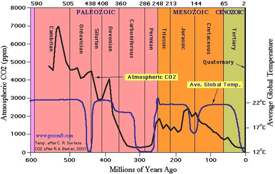 Think of all that suffering and wastage, he says about the fourth great mass extinction. I don’t think we want a comparable extinction to the one that happened 252 million years ago on our conscience, he adds. Of course, Packham is not the first person to politicise the end-Permian extinction when most plant and animal life disappeared to be replaced eventually with what became known as the age of the dinosaurs. As we can see from the graph below, even though that extinction event coincided with an uptick in CO2 levels, the general trend over a 600-million-year period was downwards ending in the near denudation currently experienced today. But scientists note that the rise started some time before the extinction event, with most of the Permian characterised by very low levels of CO2.
