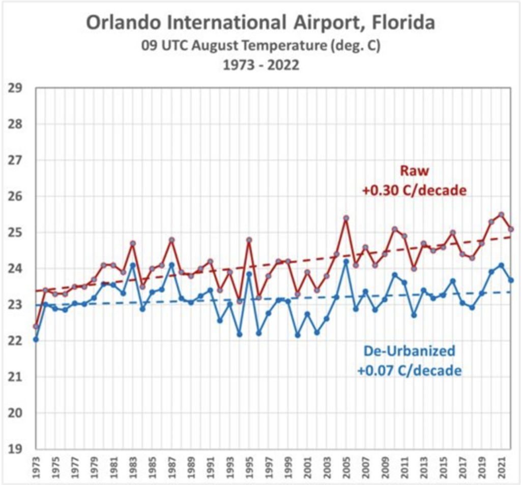 The most dramatic finding occurred at Orlando airport where decadal warming since 1973 of 0.3°C is slashed to just 0.07°C after the data has been ‘de-urbanised’. The number of passengers has soared in recent years with over 50 million people passing through the ever-growing airport, the gateway to Mickey Mouse and the Magic Kingdom. Interestingly, the divergence between the two temperature datasets becomes more pronounced from the turn of the century.