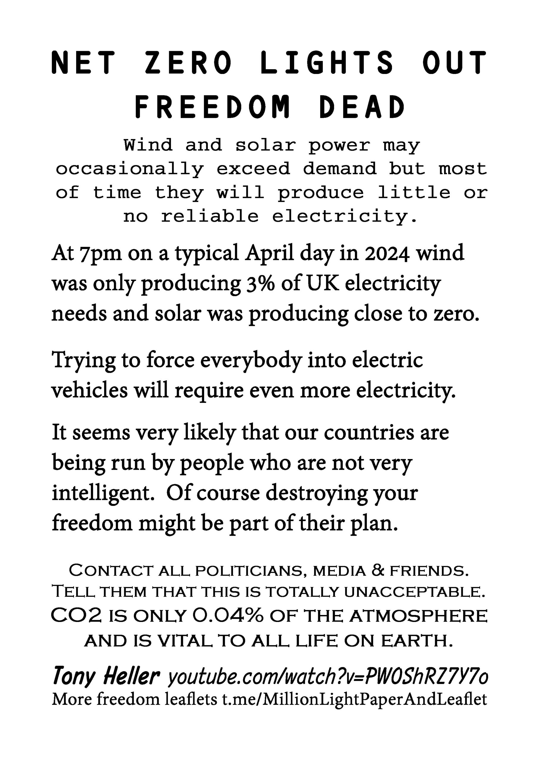 Net Zero Lights Out Freedom Dead – latest leaflet to print at home and deliver to neighbours or forward to politicians, including your local Reform Party candidate, your local vicar, media and friends online.