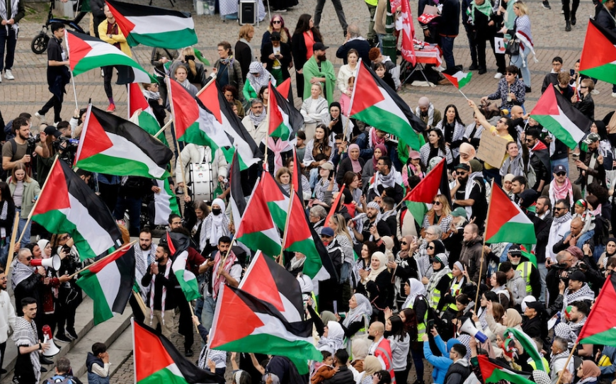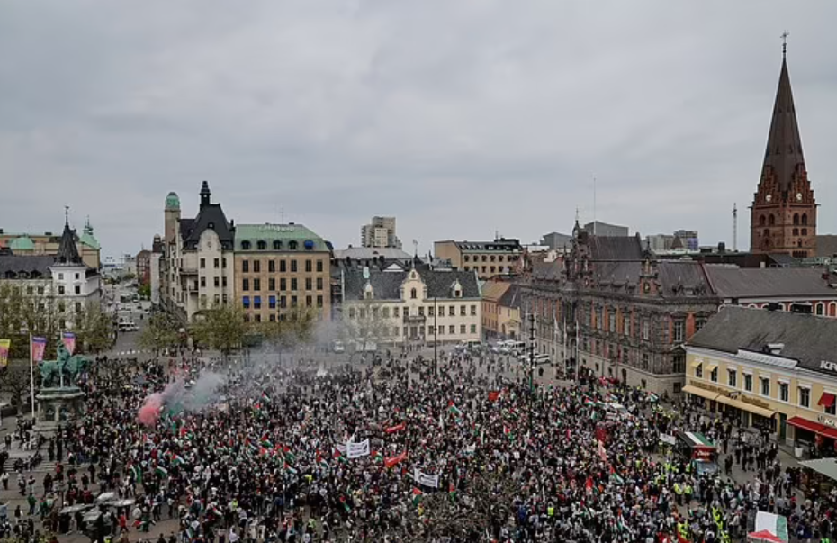 The prediction was correct, with as many as 5,000 people taking to the city’s streets today, including the young Swede – who was pictured wearing a keffiyeh, a black and white shawl commonly used to show support for Palestine, around her body in the centre of the crowd within a sea of Palestinian flags.