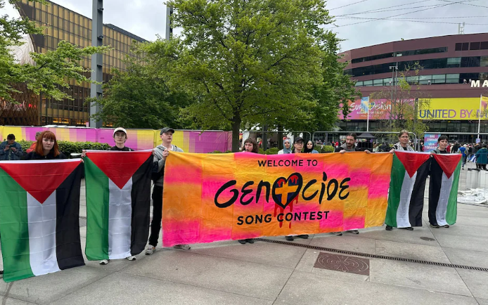 Other banners displayed messages including “welcome to Genocide song contest” and “stop using Eurovision to whitewash Israeli crimes”.