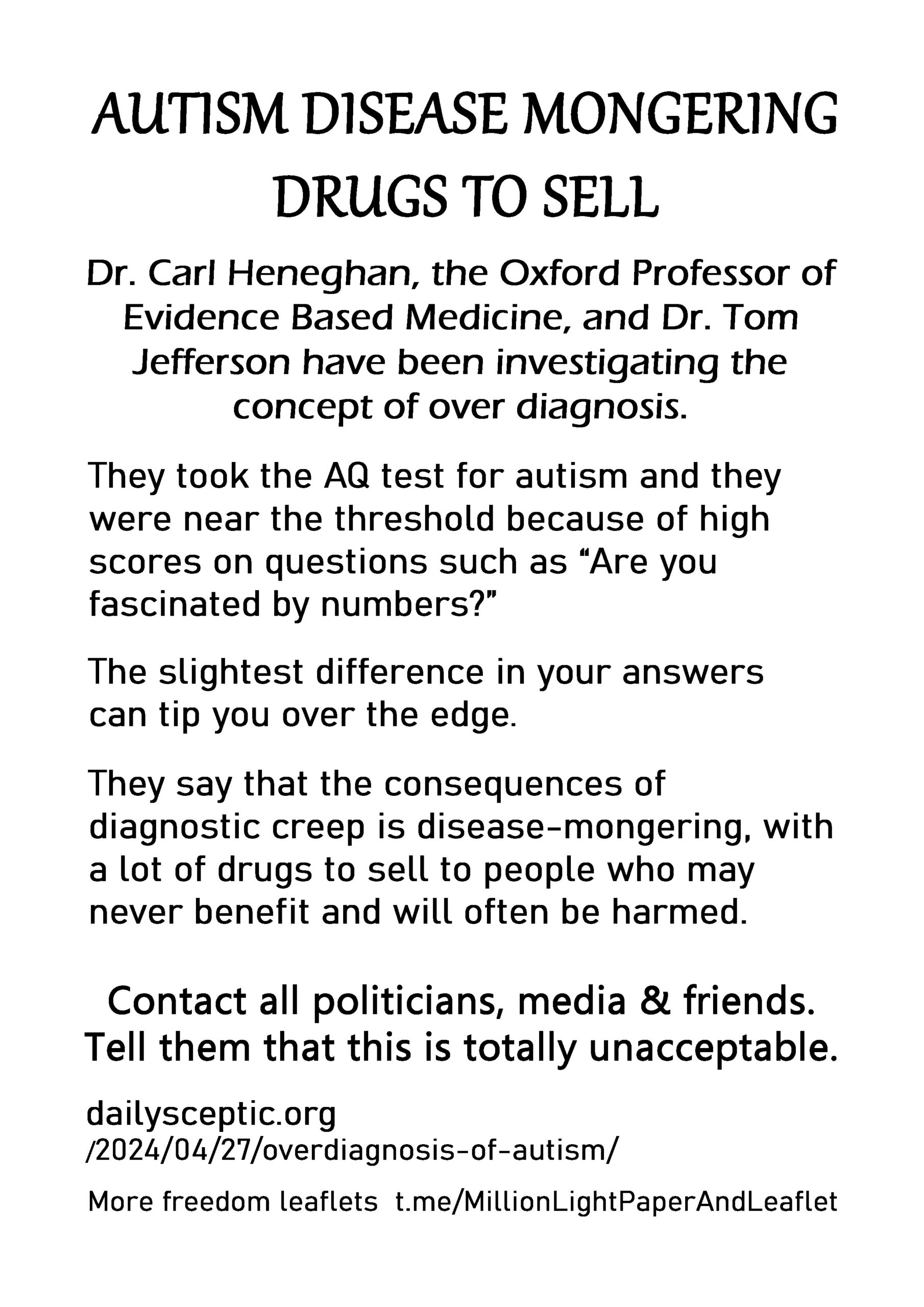 Autism Disease Mongering Drugs To Sell – latest leaflet to print at home and deliver to neighbours or forward to politicians, including your local Reform Party candidate, your local vicar, media and friends online.