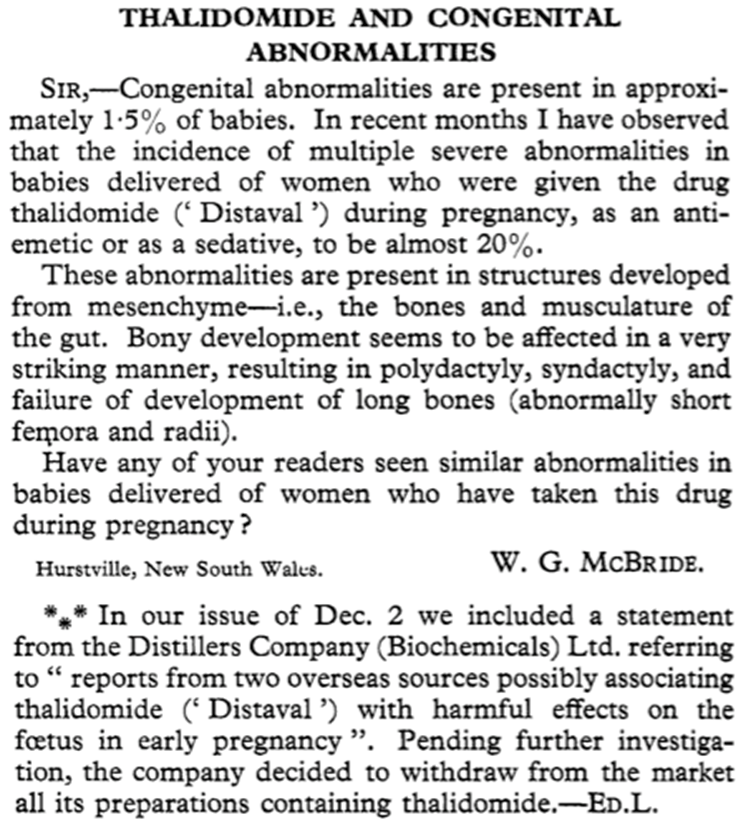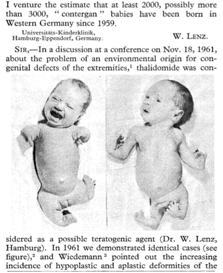 Any student of pharmacy should be familiar with the thalidomide tragedy and most of the public are at least vaguely aware of this disaster. Thalidomide was a sedative that was found to be useful in preventing morning sickness in pregnant women. It was developed by the German company Chemie Grunenthal in 1954 and was introduced onto the market in the U.K. in 1958. However, doctors started to notice an increase in the number of babies being born with birth defects and, in December 1961, the Australian gynaecologist, Dr. William McBride published a short letter in the medical journal the Lancet highlighting his concerns that thalidomide might be responsible for these birth defects. At the same time, the German doctor, Dr. Widukind Lenz noted similar concerns and, in November 1961, warned Chemie Gruenenthal of his fears. The drug was withdrawn from the market at the end of 1961 but disputes over the question of whether thalidomide did or did not cause malformations went on for months. Chemie Gruenenthal continued to deny the teratogenic effects of thalidomide for years, but there was suspicion that this was not due to honest ignorance but in order to weaken the accusations against the company (see this extract from a lecture given by Dr. Lenz for details).