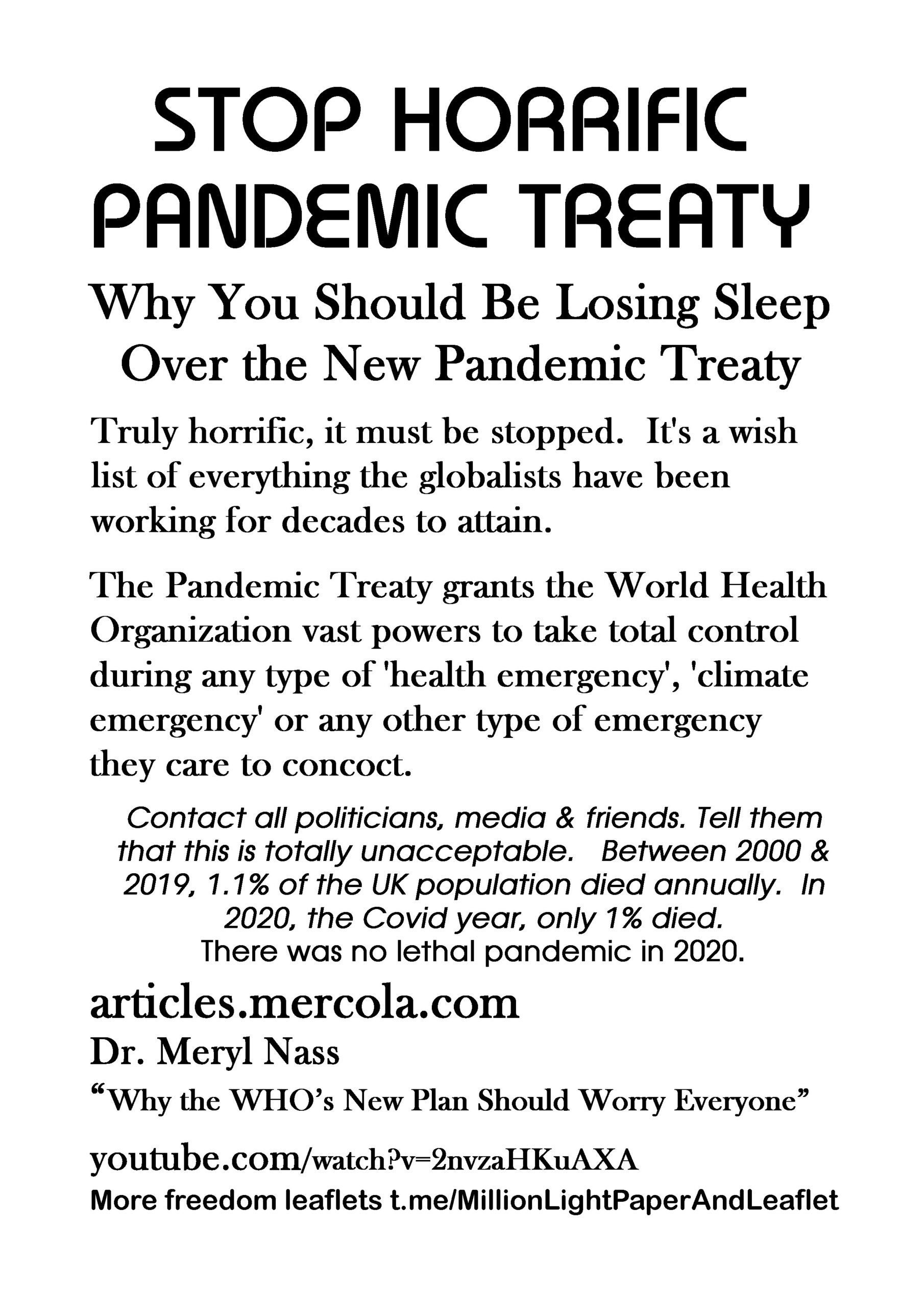 Stop Horrific Pandemic Treaty – latest leaflet to print at home and deliver to neighbours or forward to politicians, including your local Reform Party candidate, your local vicar, media and friends online.