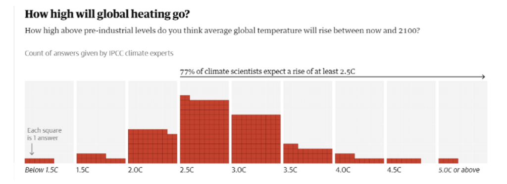 For the purposes of creating this story, the Guardian’s Environment Editor Damian Carrington contacted 843 ‘lead authors’ of the Intergovernmental Panel on Climate Change’s reports (IPCC) and 383 responded to his questions. The actual substance of the survey does not seem to have been published by the paper, but the main response Carrington wanted to get from his respondents was an estimate of how much global warming there will be by the end of the century. “World’s top climate scientists expect global heating to blast past 1.5ºC target,” claims one headline. A graphic in the article shows the responses: