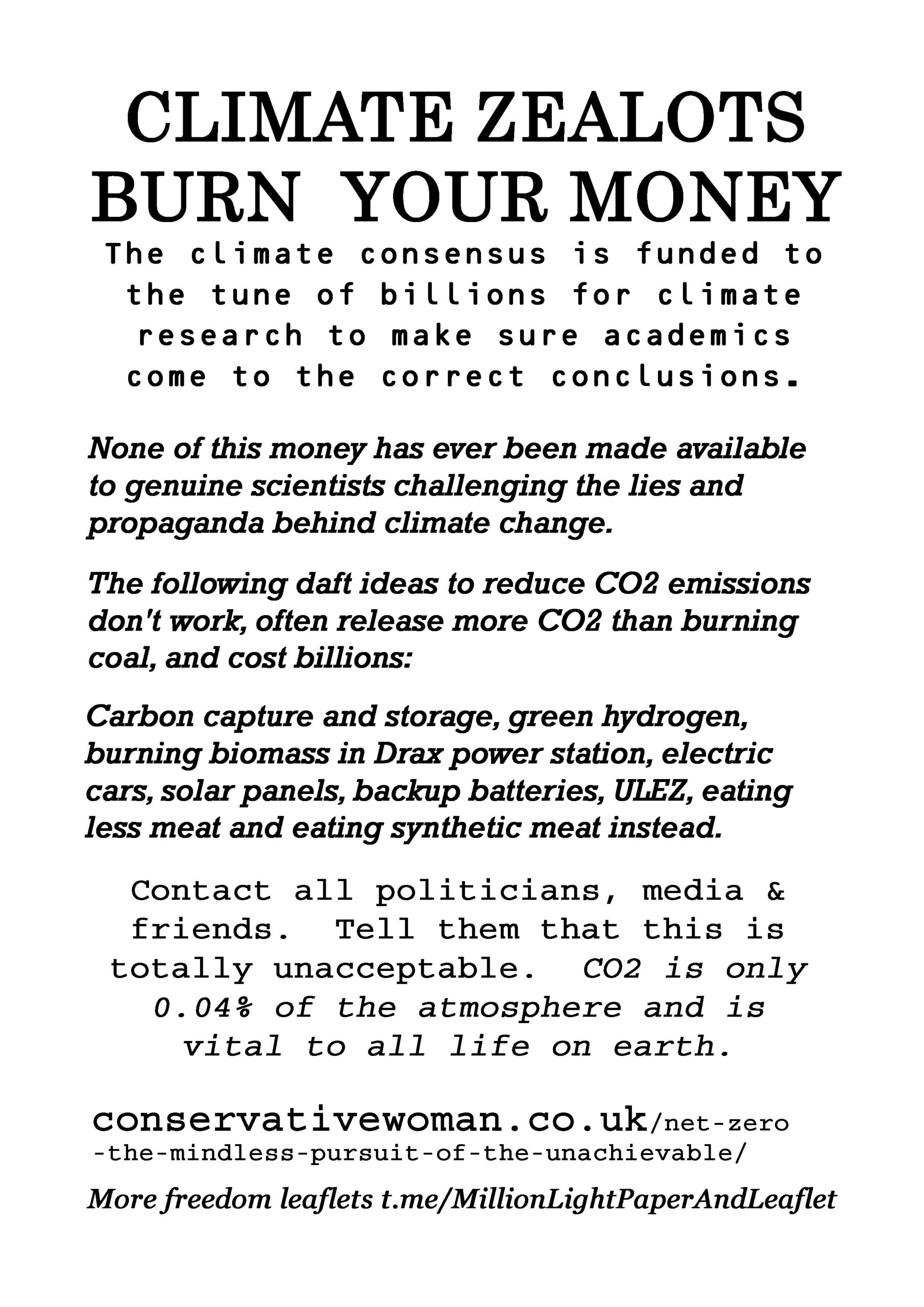 Climate Zealots Burn Your Money – latest leaflet to print at home and deliver to neighbours or forward to politicians, including your local Reform Party candidate, your local vicar, media and friends online.