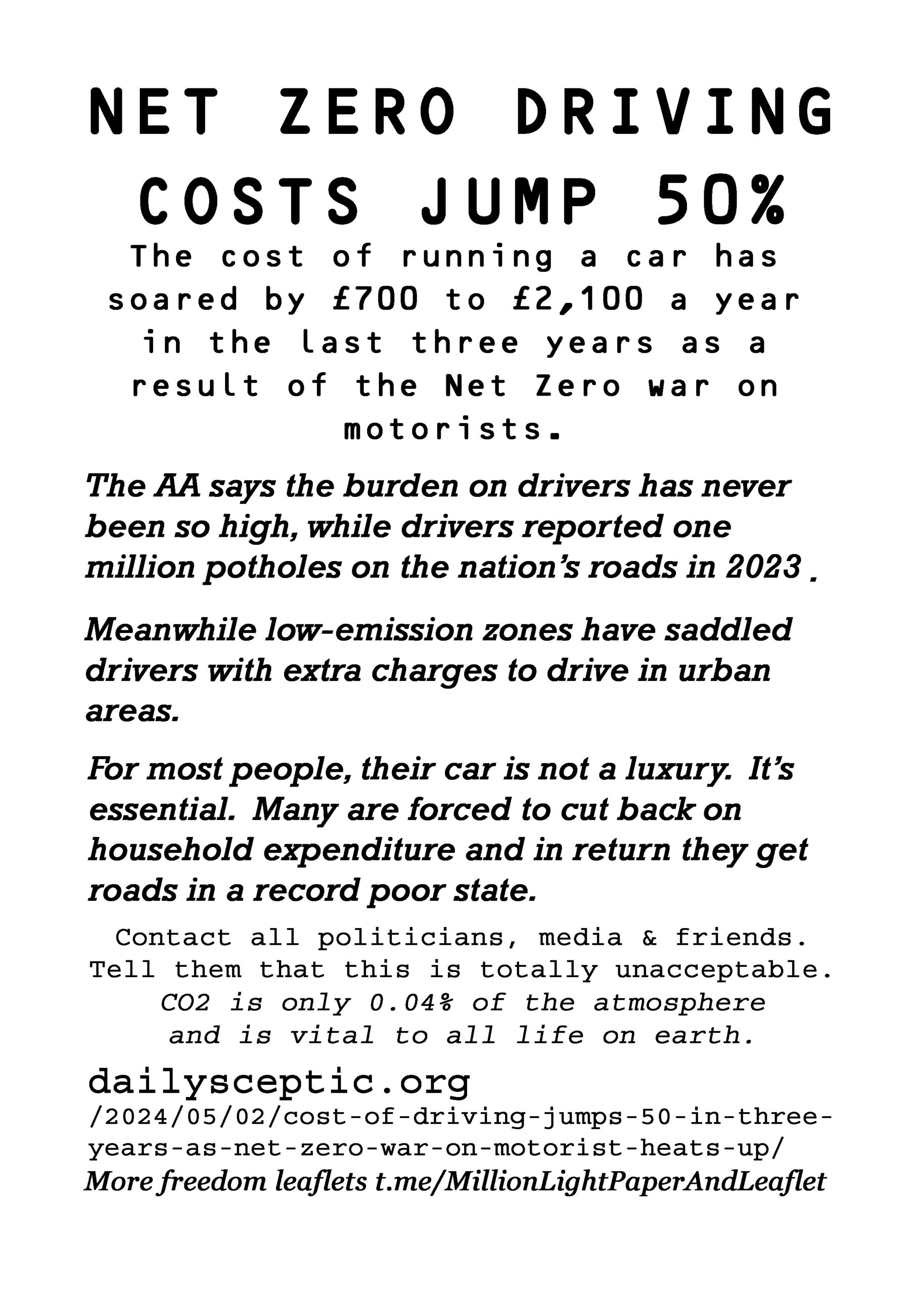 Net Zero Driving Costs Jump 50% – latest leaflet to print at home and deliver to neighbours or forward to politicians, including your local Reform Party candidate, your local vicar, media and friends online.