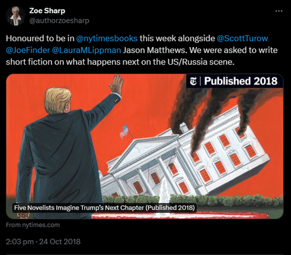 Such an unbalanced literary situation continues today. I find there are several novels and short stories by Guardianista-types imagining the violent murder of Donald Trump currently available on the market (How It Ends by Zoe Sharp was even printed in the New York Times), but none from reputable publishers treating Joe Biden similarly – although maybe that’s just because Joe’s pending appointment at Dignitas renders any sniper’s bullet wholly unnecessary anyway.