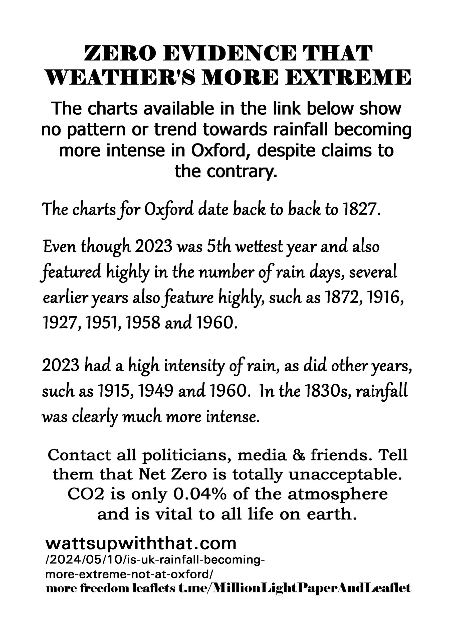 Zero Evidence That Weather’s More Extreme – latest leaflet to print at home and deliver to neighbours or forward to politicians, including your local Reform Party candidate, your local vicar, online media and friends online.