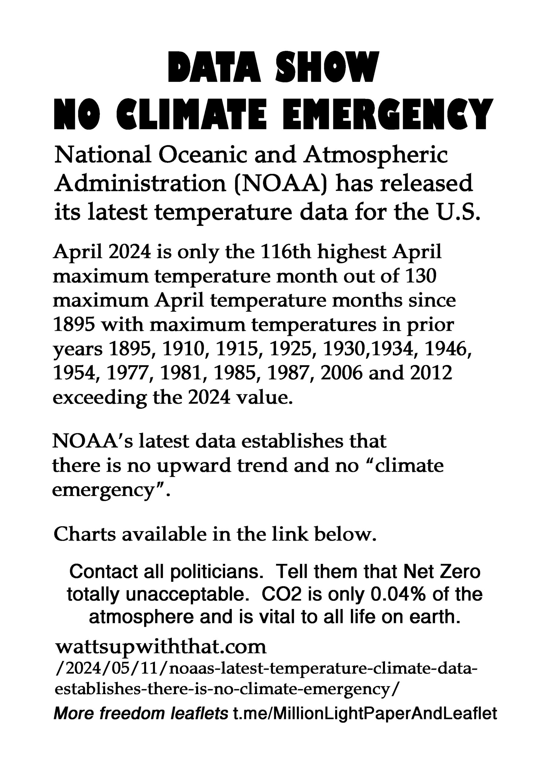 Data Show No Climate Emergency – latest leaflet to print at home and deliver to neighbours or forward to politicians, including your local Reform Party candidate, your local vicar, online media and friends online. We have over 200 leaflet ideas on the link on the leaflet.