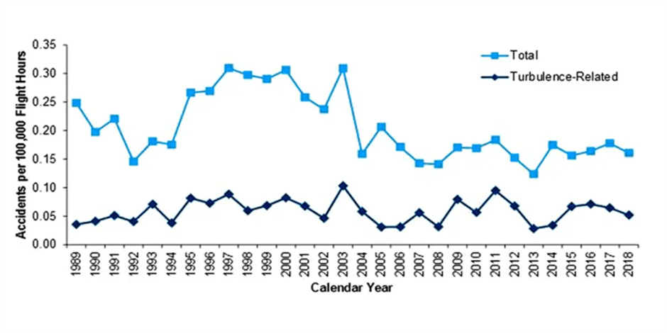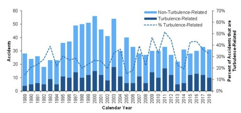 The second graph above was produced in a 2021 report from the U.S. National Transportation Safety Board. It showed no increase in passenger and aircraft accidents, allowing for the enormous growth in traffic during these decades. The NTSB concluded: āThere was no obvious trend in turbulence-related accidents during this period.ā