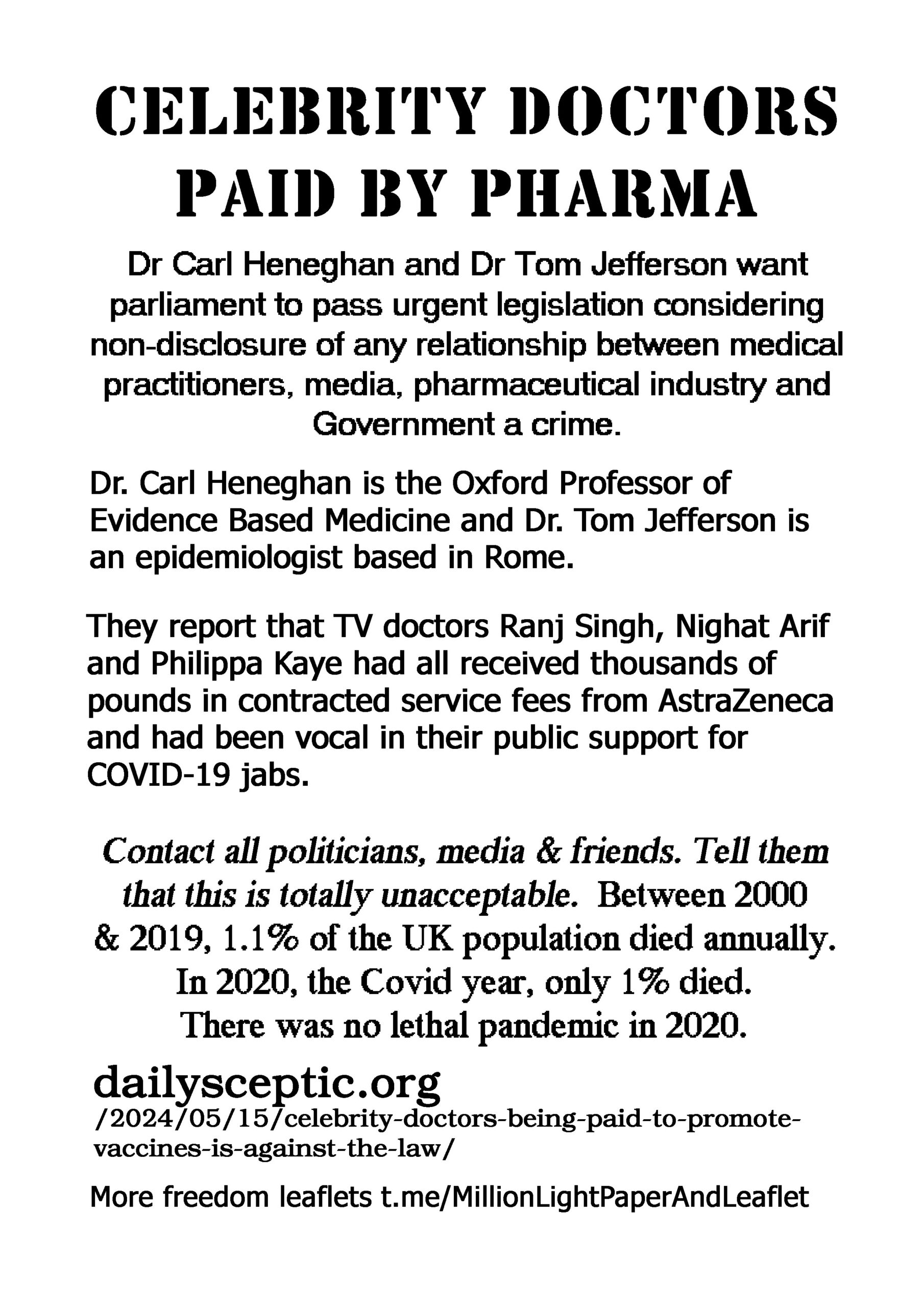 Celebrity Doctors Paid By Pharma – latest leaflet to print at home and deliver to neighbours or forward to politicians, including your election candidates, your local vicar, online media and friends online. We have over 200 leaflet ideas on the link on the leaflet.