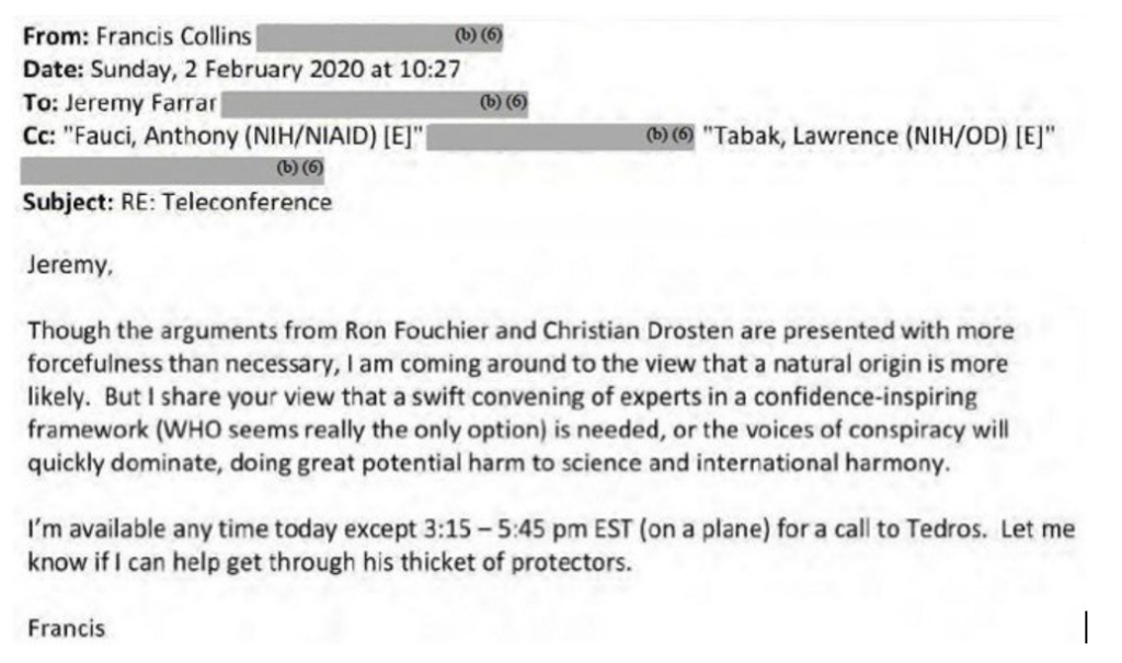 “[T]he arguments from Ron Fouchier and Christian Drosten are presented with more forcefulness than necessary,” Fauci’s boss, then NIH director Francis Collins, daintily noted in an e-mail to Farrar the next day. (See below and for all the “Farrar-Fauci” e-mails here). Nonetheless, Collins allowed that he too was “coming around to the view that a natural origin is more likely” – yet further proof that virtually the entire American or, more generally, Anglosphere side of the conversation had been leaning towards a lab origin. Collins agreed with Farrar’s suggestion of turning the matter over to the WHO, in order, he said to preserve “international harmony” – another apparent nod to how adamant the Europeans were.