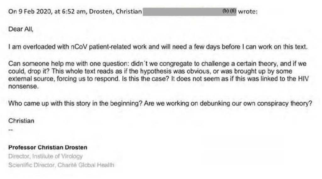When, however, Andersen and his colleagues persisted in their pursuit of the “lab leak” hypothesis even after their upbraiding, this would provoke a remarkably pissy e-mail from none other than Christian Drosten (see below), who wondered, in effect, why the Anglosphere scientists were even giving the lab origin hypothesis the time of day. “Didn’t we congregate to challenge a certain theory [i.e. ‘lab leak’], and, if we could, drop it?” Drosten asked imperiously, “…Are we working on debunking our own conspiracy theory?”