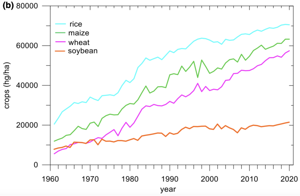 The above graph shows the enormous rises in Chinese yields for staples such as rice, maize and wheat measured by hectogram per hectare. The researchers note that improved agricultural management has had a part to play, although yields started to rise even during the instabilities of the immediate post-Mao period. The scientists also note that there is no obvious increasing trend in precipitation, while Chinaβs air temperature and the global CO2 rise βhave the same trend as crop yieldβ. Recent lower levels of Arctic sea ice are considered an βindirect processβ, but the conclusions of the paper are clear. Warming extends the growing season and reduces damage from the cold. Increasing CO2 improves the photosynthetic rate of crops, improves growth rates and dry matter content, and thus improves food production.