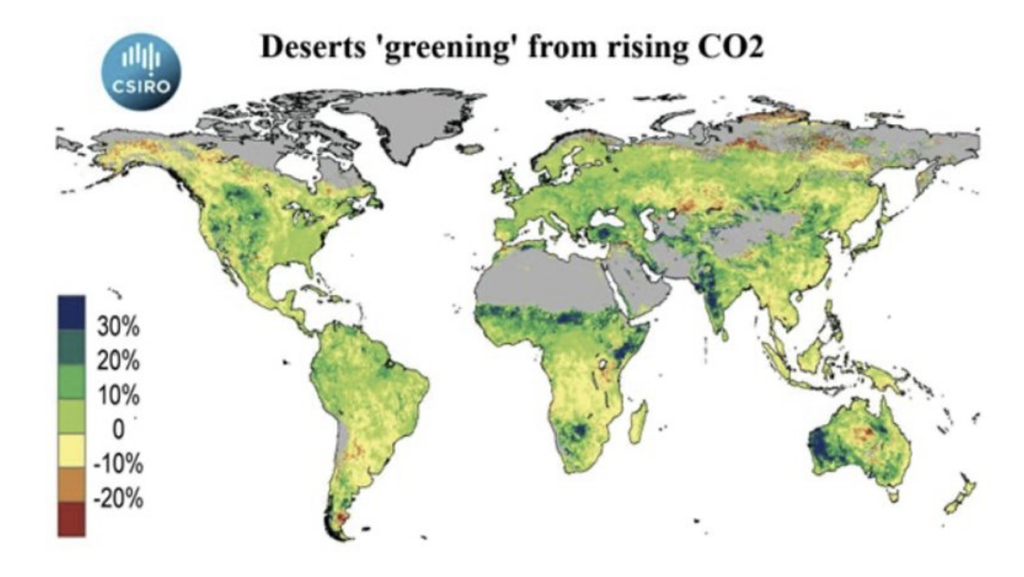 Interesting that areas like the Sahel, semi-desert just below the Sahara are greening. If they were allowed some affordable and reliable energy which also fractionally increased CO2 levels and thus photosynthesis and somewhat reduced the need for rain for plant growth, the increase in growth would be even greater.