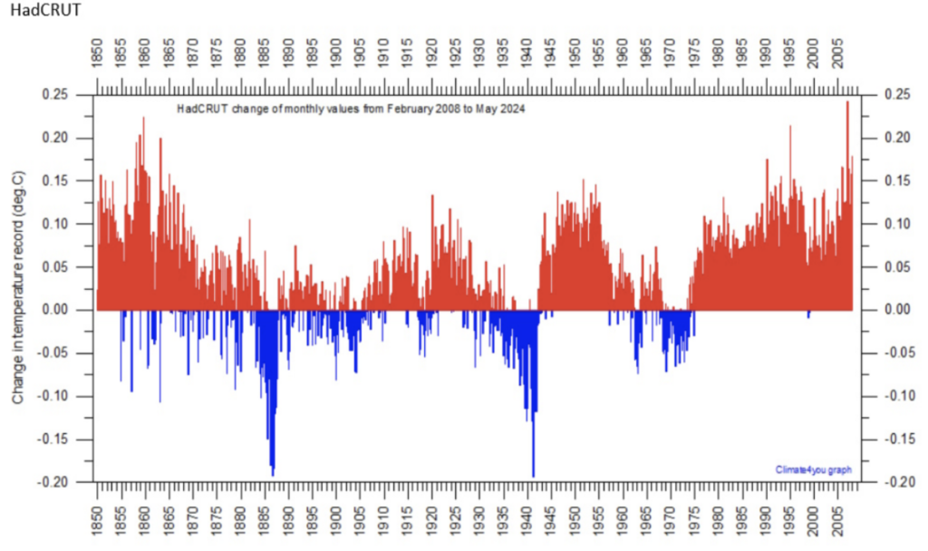 Since that time, the Met Office has made further adjustments to its HadCRUT database and the effect can be seen in the graph below showing all the retrospective changes made since 2008.