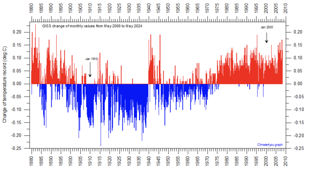 HadCRUT is not the only global database to add warming and cooling in ways that conveniently emphasise the ‘hockey stick’ nature of recent temperature trends. The excellent climate4you site provides the graph above as well as the illustration below showing what is going on at NASA’s GISS database.