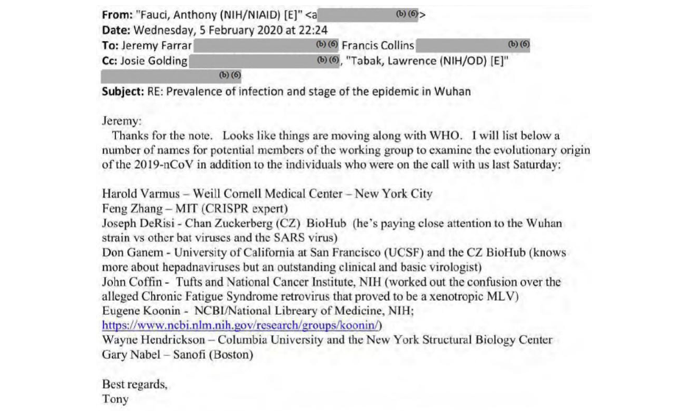Much of the early discussion in the ‘Farrar-Fauci’ e-mails was precisely about the formation of the investigative team, and, encouraged by Farrar, who was directly in touch with the WHO, Anthony Fauci offered his own suggestions for potential team members. See his February 5th 2020 e-mail below.