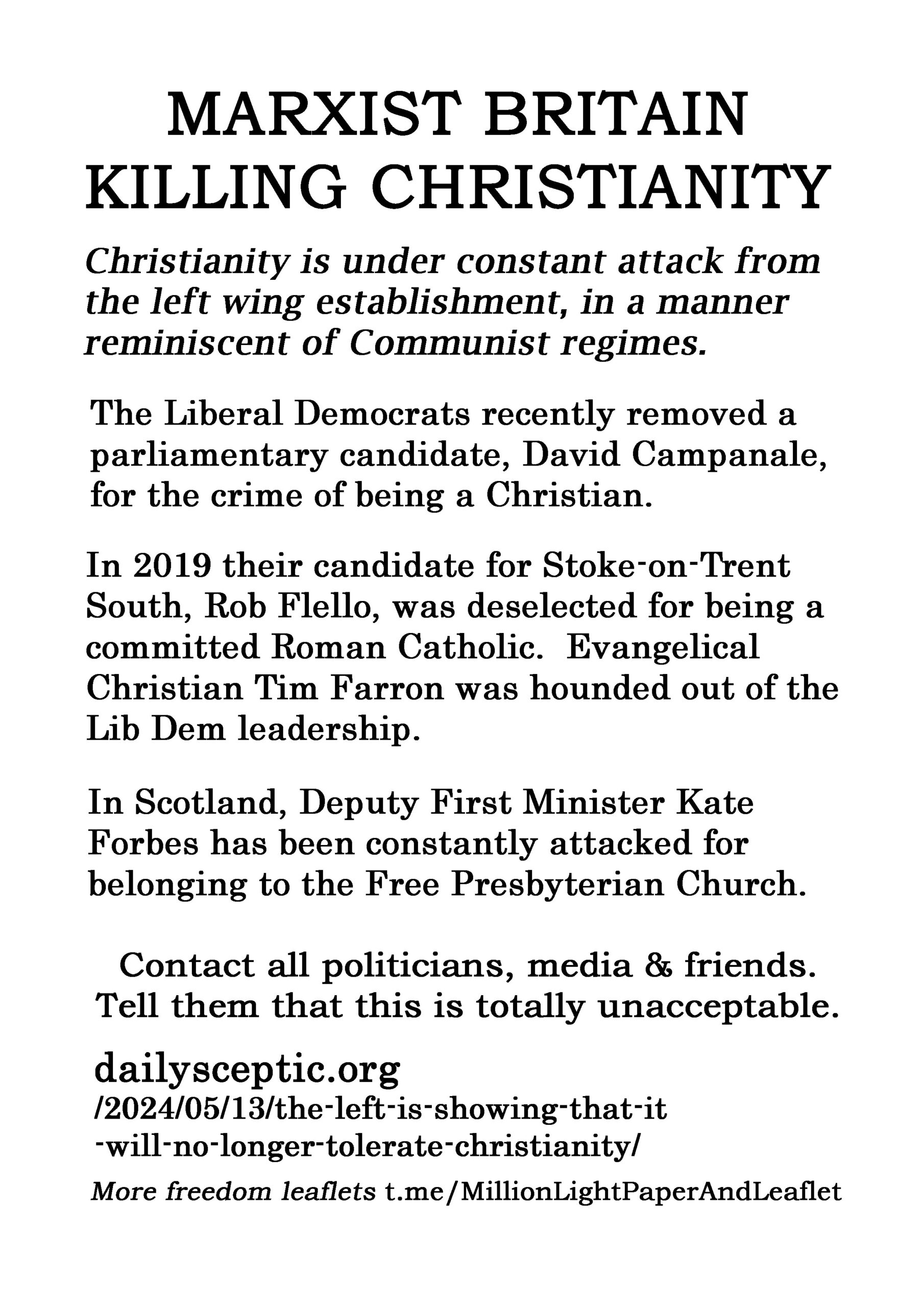 Marxist Britain Killing Christianity – latest leaflet to print at home and deliver to neighbours or forward to politicians, including your local Reform Party candidate, your local vicar, online media and friends online. We have over 200 leaflet ideas on the link on the leaflet.