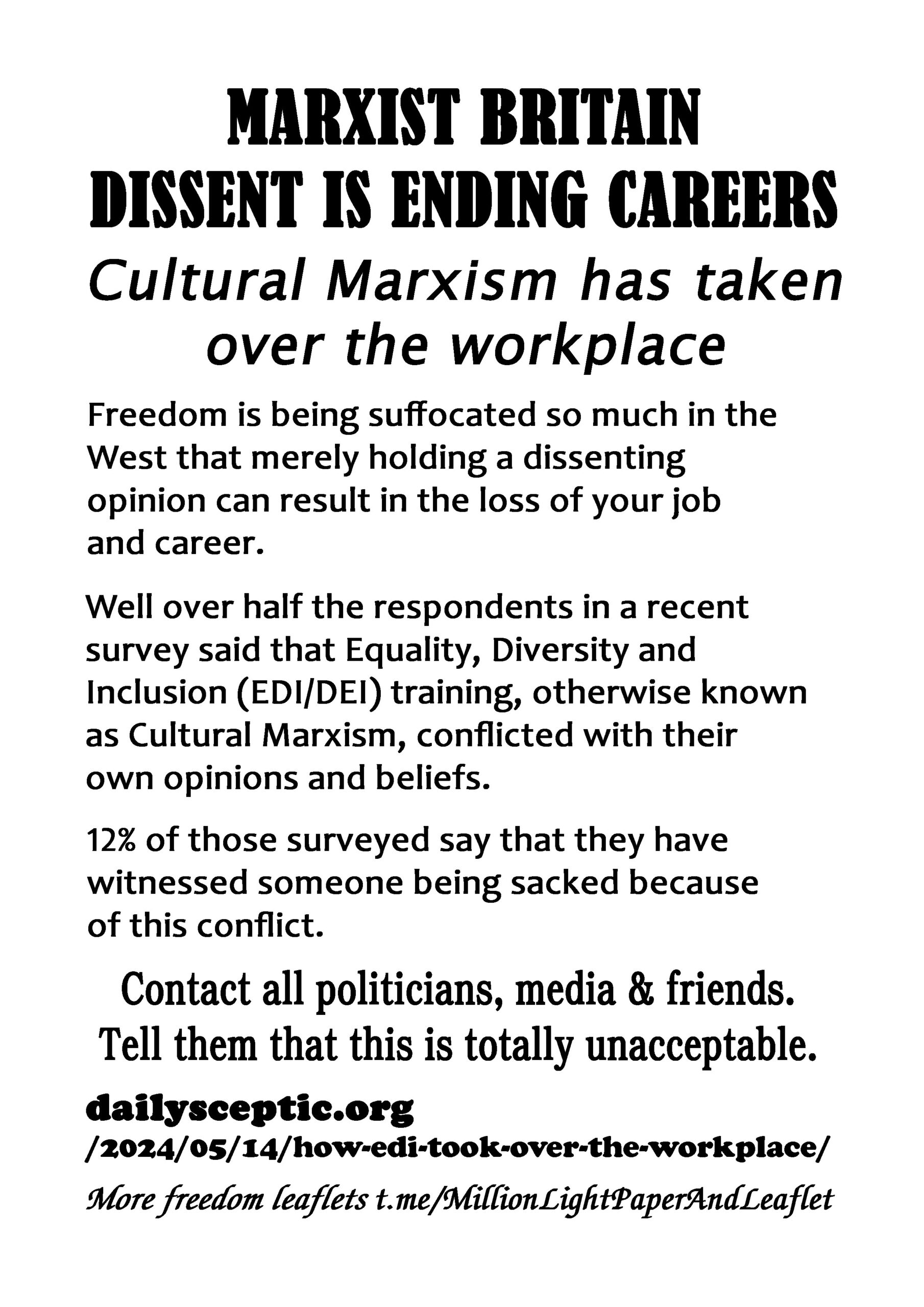 Marxist Marxist Britain Dissent is Ending Careers – latest leaflet to print at home and deliver to neighbours or forward to politicians, including your local Reform Party candidate, your local vicar, online media and friends online. We have over 200 leaflet ideas on the link on the leaflet.