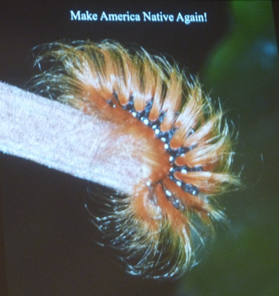 As I discussed last week, certain horticulturalists out there seem preoccupied with asserting that those who insist upon planting native species of flowers, trees and shrubs in their gardens are some kind of secret crypto-fascists, obsessed with maintaining the purity of their own racial homeland, as well as that of their flowerbeds – ‘Blood and Soil’, as the Nazis used to say. An excellent example grew out of the annual conference of the California Native Plant Society in 2018, which concluded with the following photo of a breed of orange American caterpillar which happened to bear a remarkable resemblance to an equally orange breed of American President, Donald Trump: