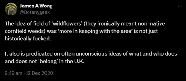 Clearly, people like Jensen were gigantic horticultural lunatics. Yet, in expressing their profound desire for total nonsenses like ‘multihorticulturalism’, aren’t the woke gardeners of today, whether working for the BBC or NYT, equally as lunatic themselves, just from a directly opposing political perspective, of extreme Left rather than extreme Right? Some of these people can often seem just as vehemently anti-white as the likes of Jensen were once vehemently pro-white. I repeat a tweet here from my previous ‘racist gardening’ article from another leading BBC gardener, James Wong: