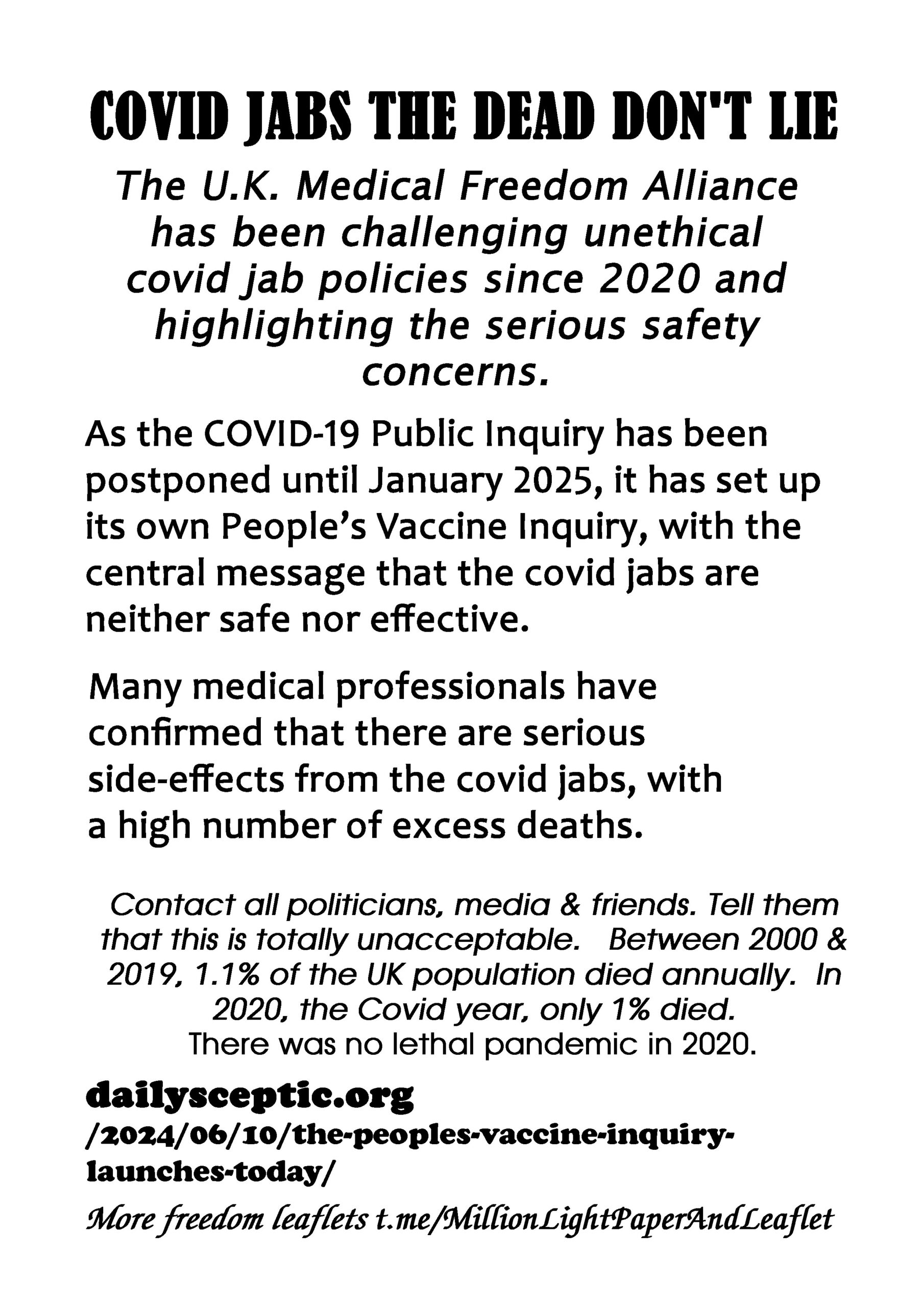 Covid Jabs The Dead Don’t Lie – latest leaflet to print at home and deliver to neighbours or forward to politicians, including your local Reform Party candidate, your local vicar, online media and friends online. We have over 200 leaflet ideas on the link on the leaflet.