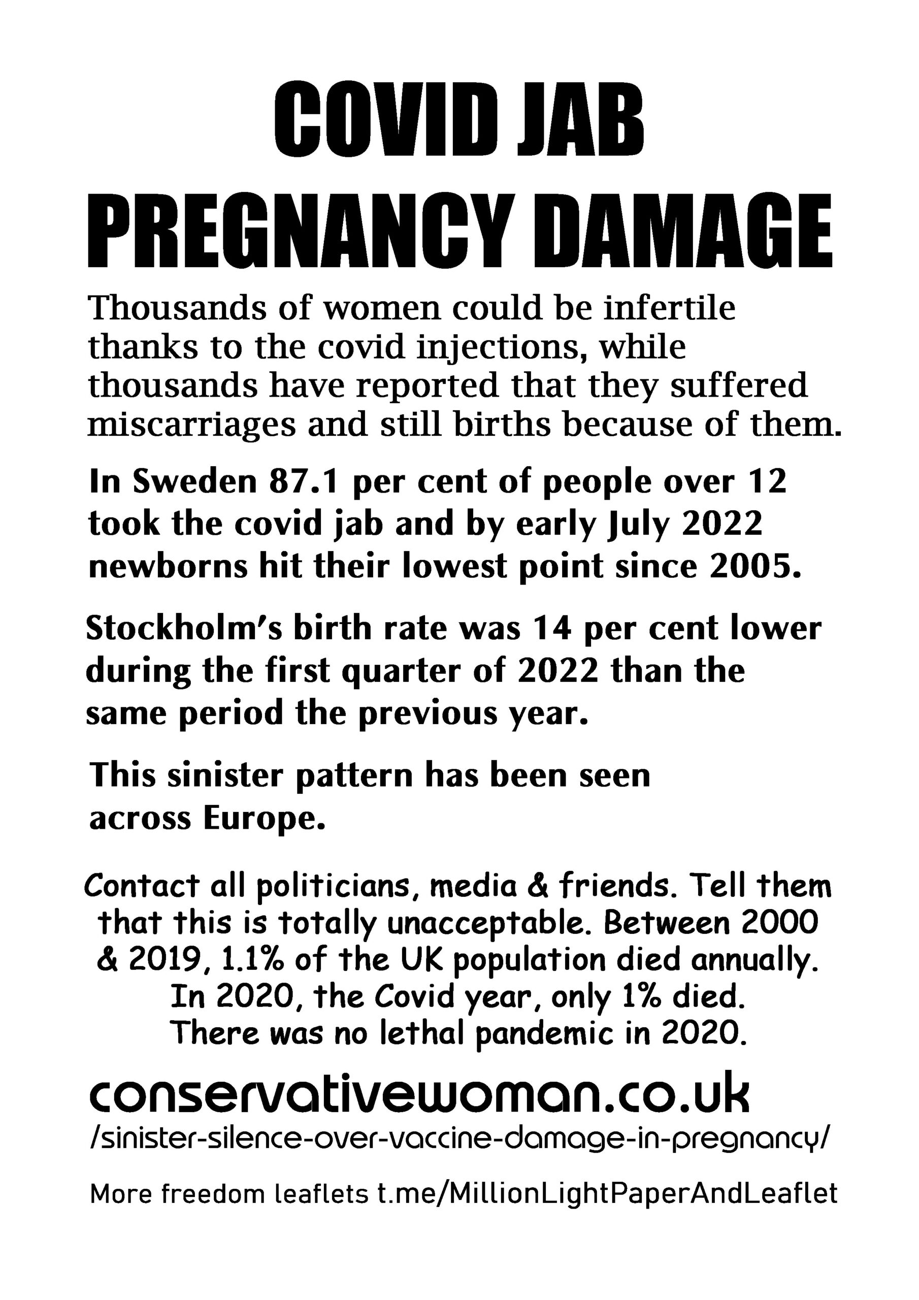 Covid Jab Pregnancy Damage – latest leaflet to print at home and deliver to neighbours or forward to politicians, including your local Reform Party candidate, your local vicar, online media and friends online. We have over 200 leaflet ideas on the link on the leaflet.
