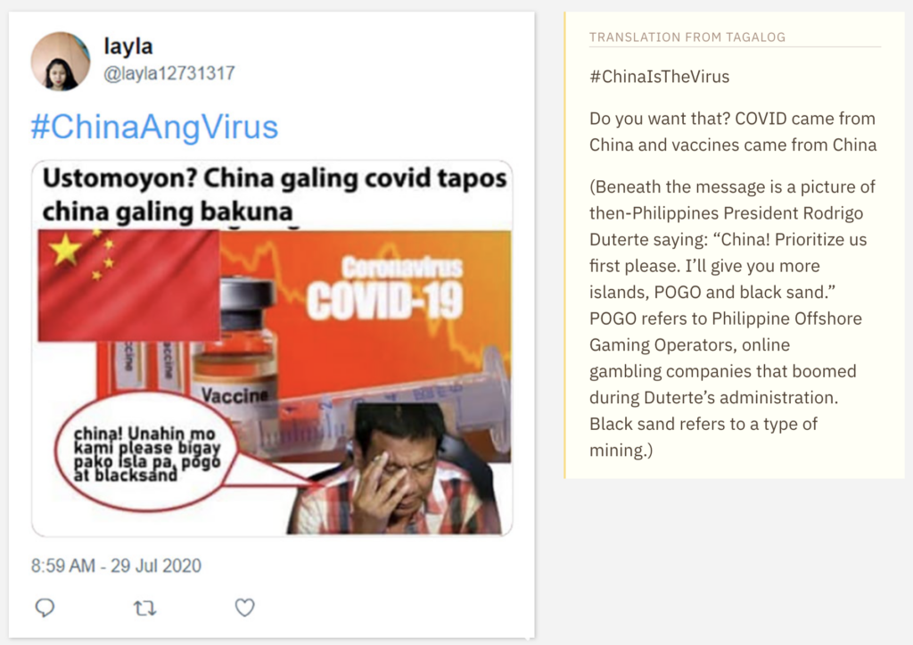 “COVID came from China and the VACCINE also came from China, don’t trust China!” one typical tweet from July 2020 read in Tagalog. The words were next to a photo of a syringe beside a Chinese flag and a soaring chart of infections. Another post read: “From China – PPE, Face Mask, Vaccine: FAKE. But the Coronavirus is real.”
