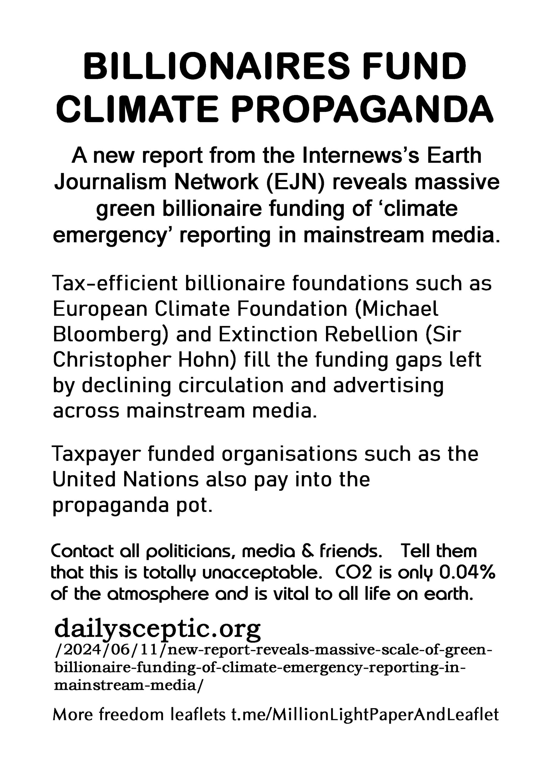 Billionaires Fund Climate Propaganda – latest leaflet to print at home and deliver to neighbours or forward to politicians, including your local Reform Party candidate, your local vicar, online media and friends online. We have over 200 leaflet ideas on the link on the leaflet.