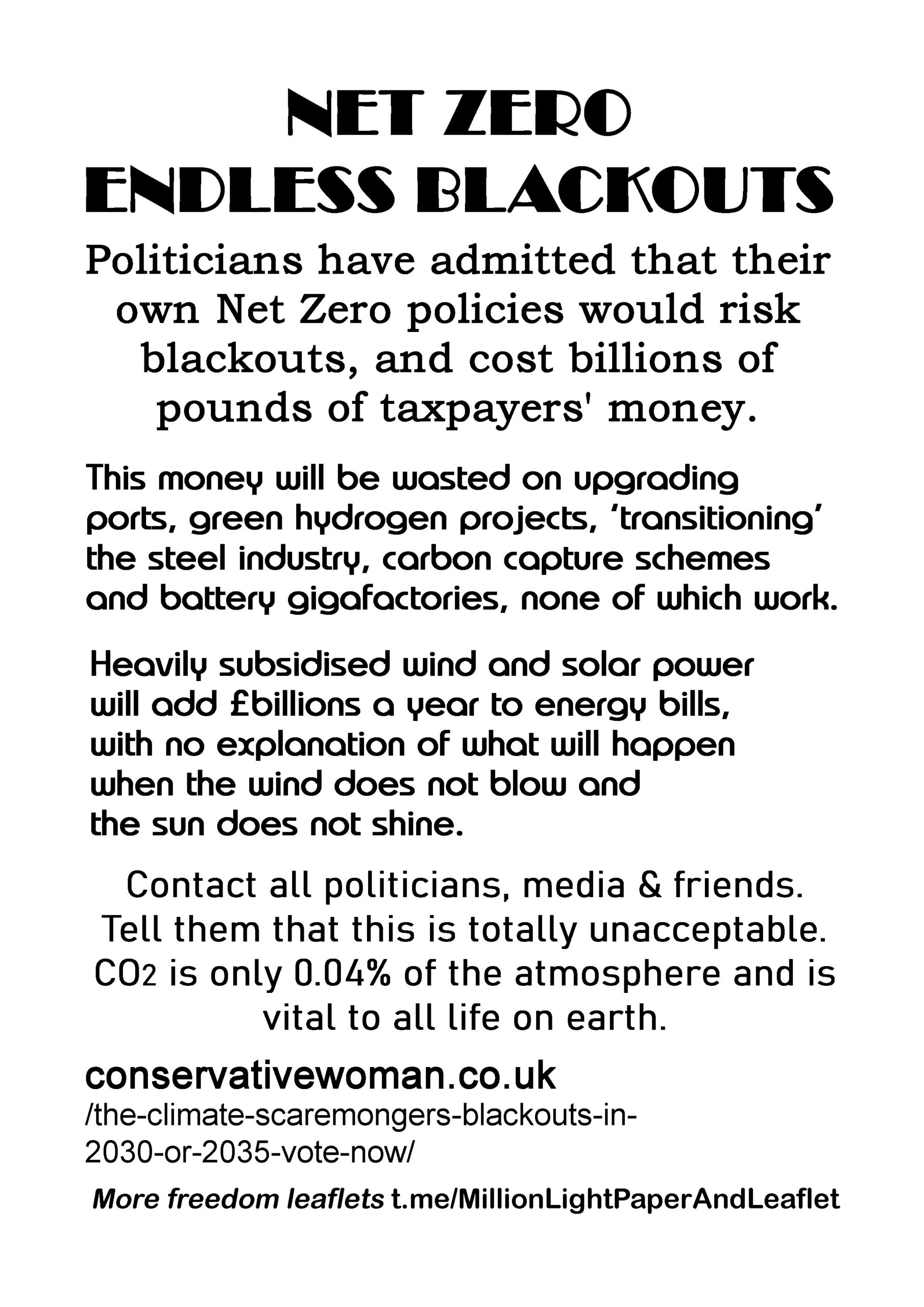 Net Zero Endless Blackouts – latest leaflet to print at home and deliver to neighbours or forward to politicians, including your local Reform Party candidate, your local vicar, online media and friends online. We have over 200 leaflet ideas on the link on the leaflet.