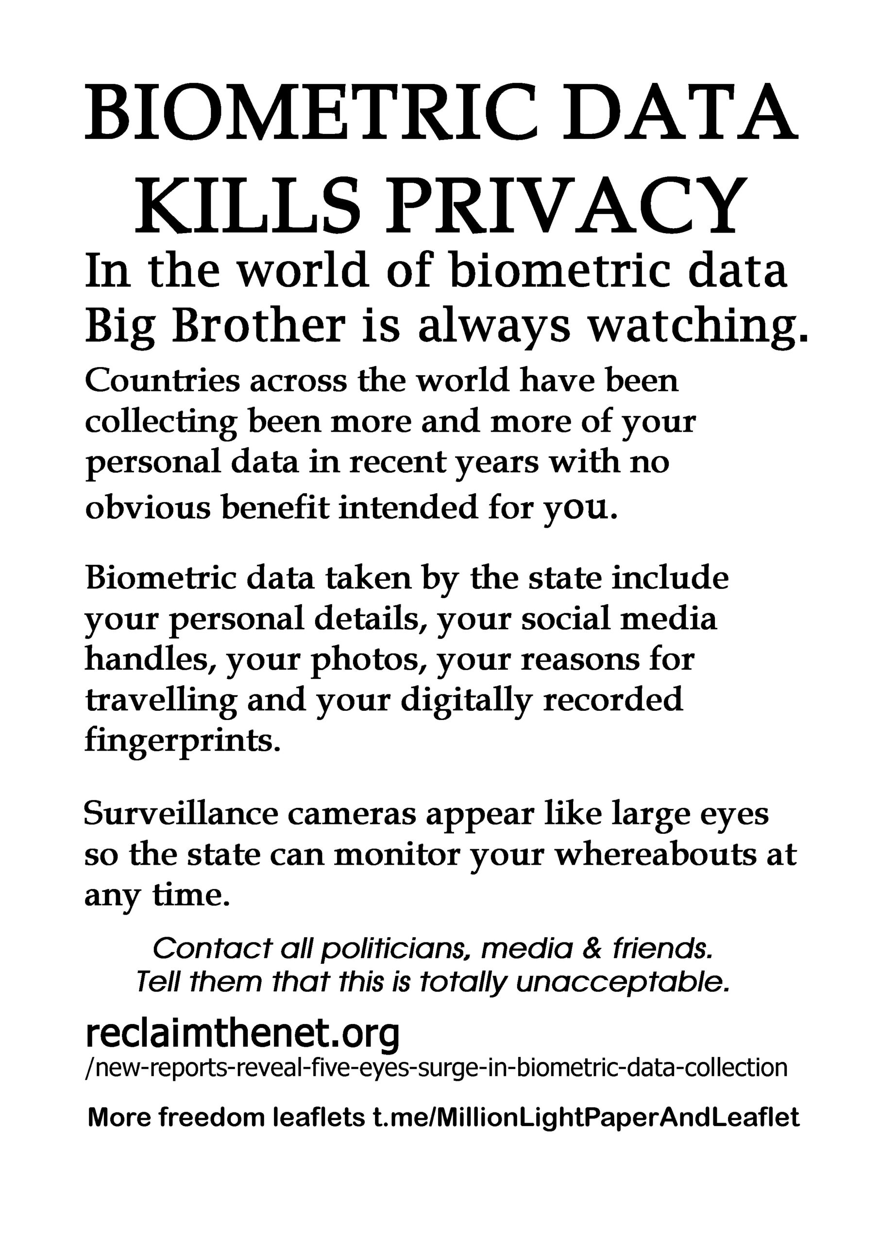 Biometric Data Collection Kills Privacy – latest leaflet to print at home and deliver to neighbours or forward to politicians, including your local Reform Party candidate, your local vicar, online media and friends online. We have over 200 leaflet ideas on the link on the leaflet.