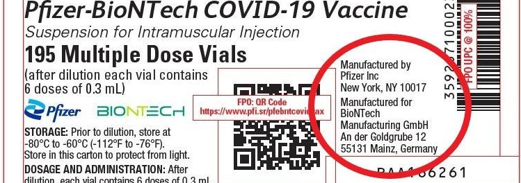 And, secondly, Pfizer does not even have a COVID-19 vaccine. As I have shown over and over again, Pfizer is merely a contract manufacturer which produces said COVID-19 vaccine on behalf of the German firm BioNTech. BioNTech is the legal manufacture and ‘owner’ of the product. It should not have taken the Kansas Attorney General’s office any great effort of research to find this out, since the fact that Pfizer manufactures the drug on BioNTech’s behalf is clearly indicated on the product’s very packaging, as can be seen below.