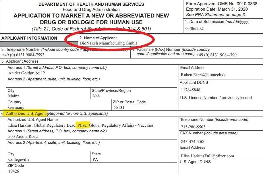If any pertinent misleading statements, perhaps indeed – let’s not mince words – outright fraudulent claims, were made, they would, of course, have been made in the authorisation process, not in any non-existent ‘marketing’. But here too, the exact same relationship of principal (BioNTech) and agent (Pfizer) exists as in the manufacturing process. Pfizer serves as BioNTech’s agent, as can be seen in the Biologics Licence Application below.