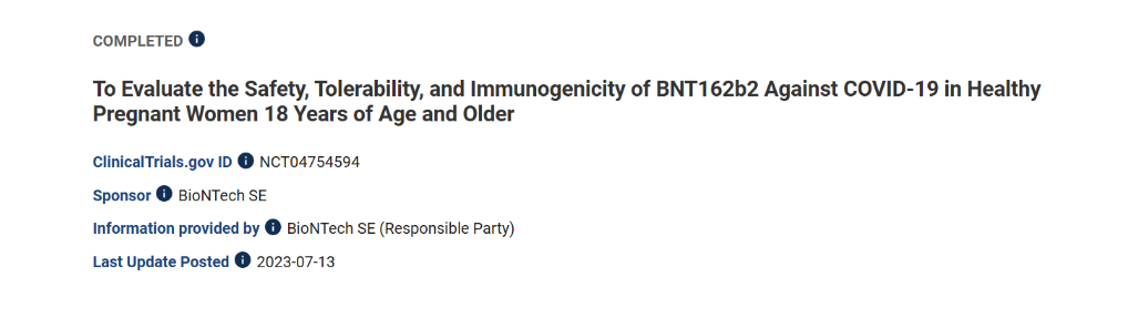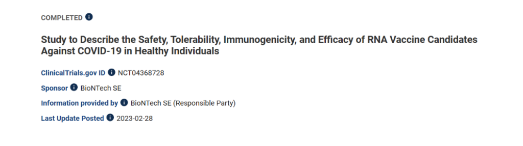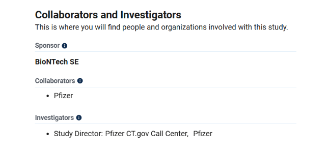 Since it is not in fact its product, unsurprisingly Pfizer was not the sponsor of the clinical trial of “its” COVID-19 vaccine. BioNTech was, and it was the party responsible for the submission of materials to be made publicly available on the federal Government’s clinical trials website.
