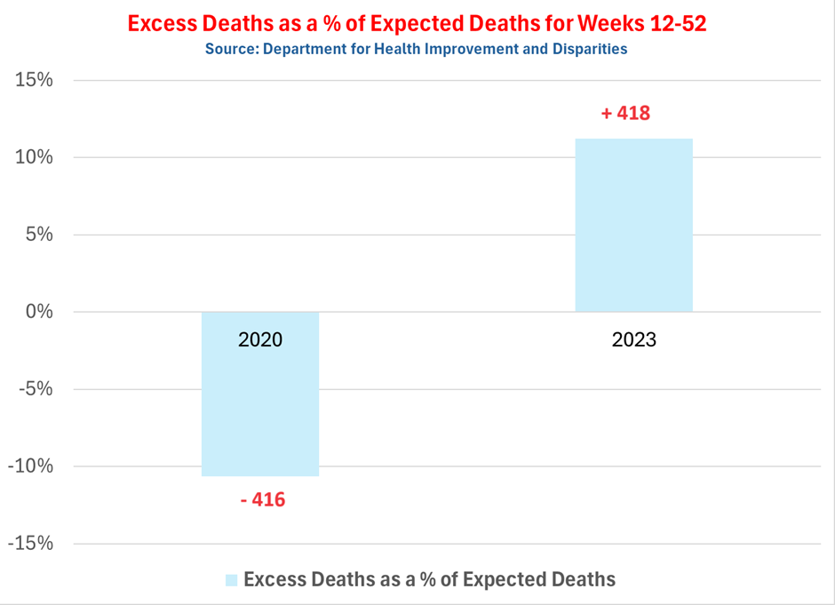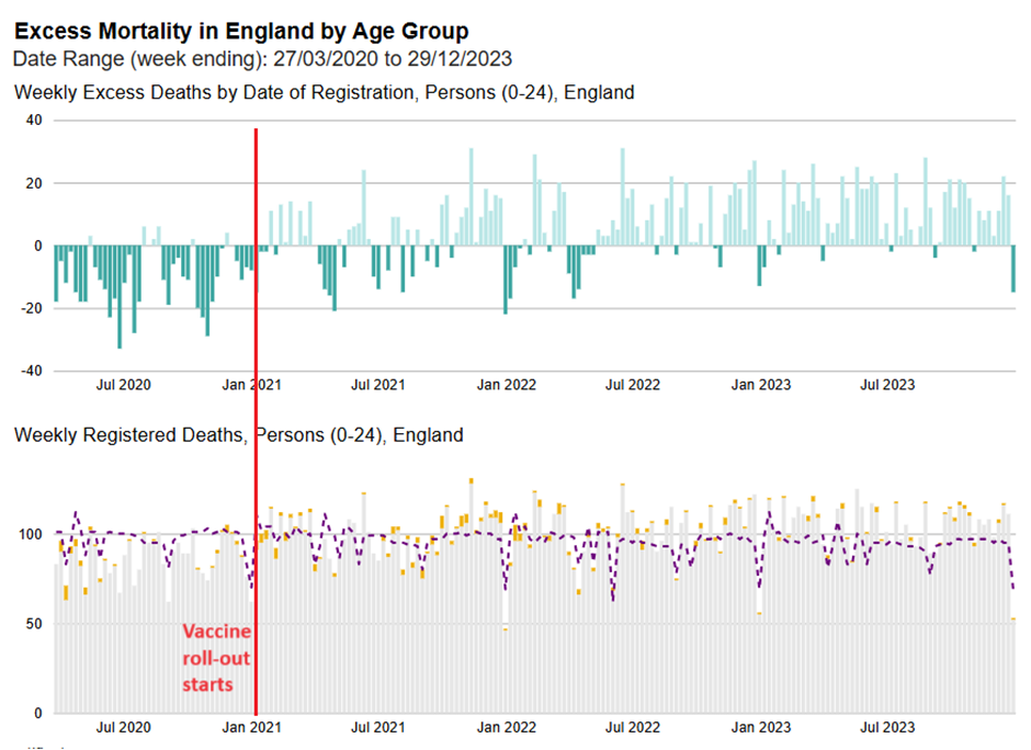 Firstly, let’s see if I can alarm you. In 2020 from the start of the first lockdown to the year end there were 3,497 deaths in the age group, that’s 416 (11%) fewer deaths than were expected. Let’s gloss over the fact that, despite a supposedly ‘once in a century’ pandemic, 2020 was the safest year ever to be a 0-24 year-old – though it wasn’t safe because young people were protected from Covid but because road accidents and murders, the big killers of young people, decreased. Conversely, from April 2023 to December 2023 there were 4,142 deaths, 645 (18%) more than in the same period in 2020 and 418 (11%) more deaths than were expected.